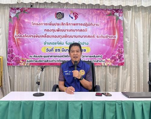 นายเอกศักดิ์ บุญพา นายอำเภอแจ้ห่ม เป็นประธานเปิดโครงการเพิ่มประสิทธิภาพการปฏิบัติงานกองทุนพัฒนาบทบาทสตรีแก่กลไกการขับเคลื่อนกองทุนพัฒนาบทบาทสตรี กิจกรรมเพิ่มประสิทธิภาพการปฏิบัติงานกองทุนพัฒนาบทบาทสตรีแก่กลไกการขับเคลื่อนกองทุนพัฒนาบทบาทสตรี ระดับอำเภอ เพื่อสร้างความรู้ความเข้าใจในการดำเนินงานกองทุนพัฒนาบทบาทสตรีแก่กลไกการขับเคลื่อนกองทุนพัฒนาบทบาทสตรี และเพื่อพัฒนาทักษะการปฏิบัติงานกองทุนพัฒนาบทบาทสตรีแก่กลไกการขับเคลื่อนกองทุนพัฒนาบทบาทสตรี โดยกลุ่มเป้าหมาย คือคณะทำงานขับเคลื่อนกองทุนพัฒนาบทบาทสตรีตำบล/อาสาสมัครผู้ประสานงานกองทุนพัฒนาบทบาทสตรีหมู่บ้าน/ชุมชนจำนวน 30 คน และเจ้าหน้าที่โครงการ จำนวน 2 คน รวมทั้งสิ้น 32 คน